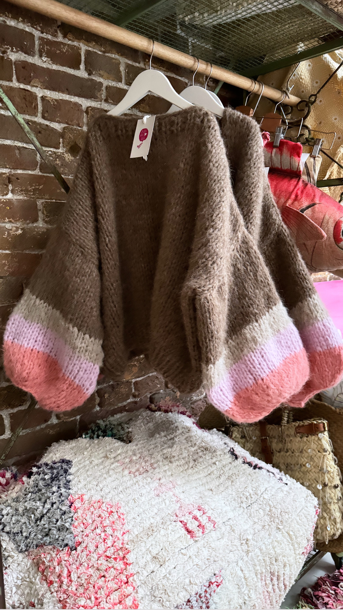 Beautiful sweater handmade of soft Alpaca/Merino wool in amazing color brown with colorful sleeves.