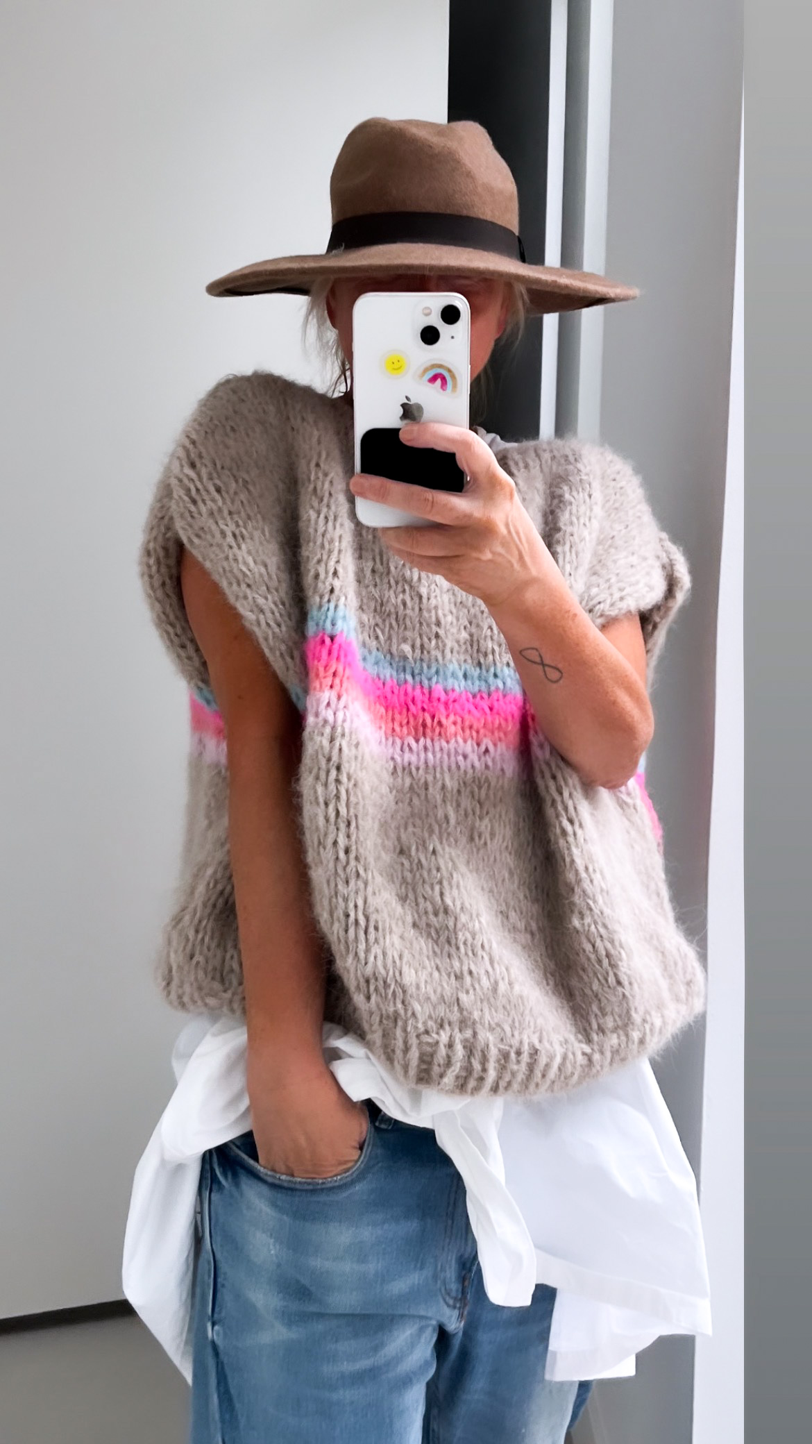 Heerlijke spencer en lekker groot. Ze worden gemaakt van zachte Alpaca/Merino Wol met de bekende Sunshine strepen in het midden.